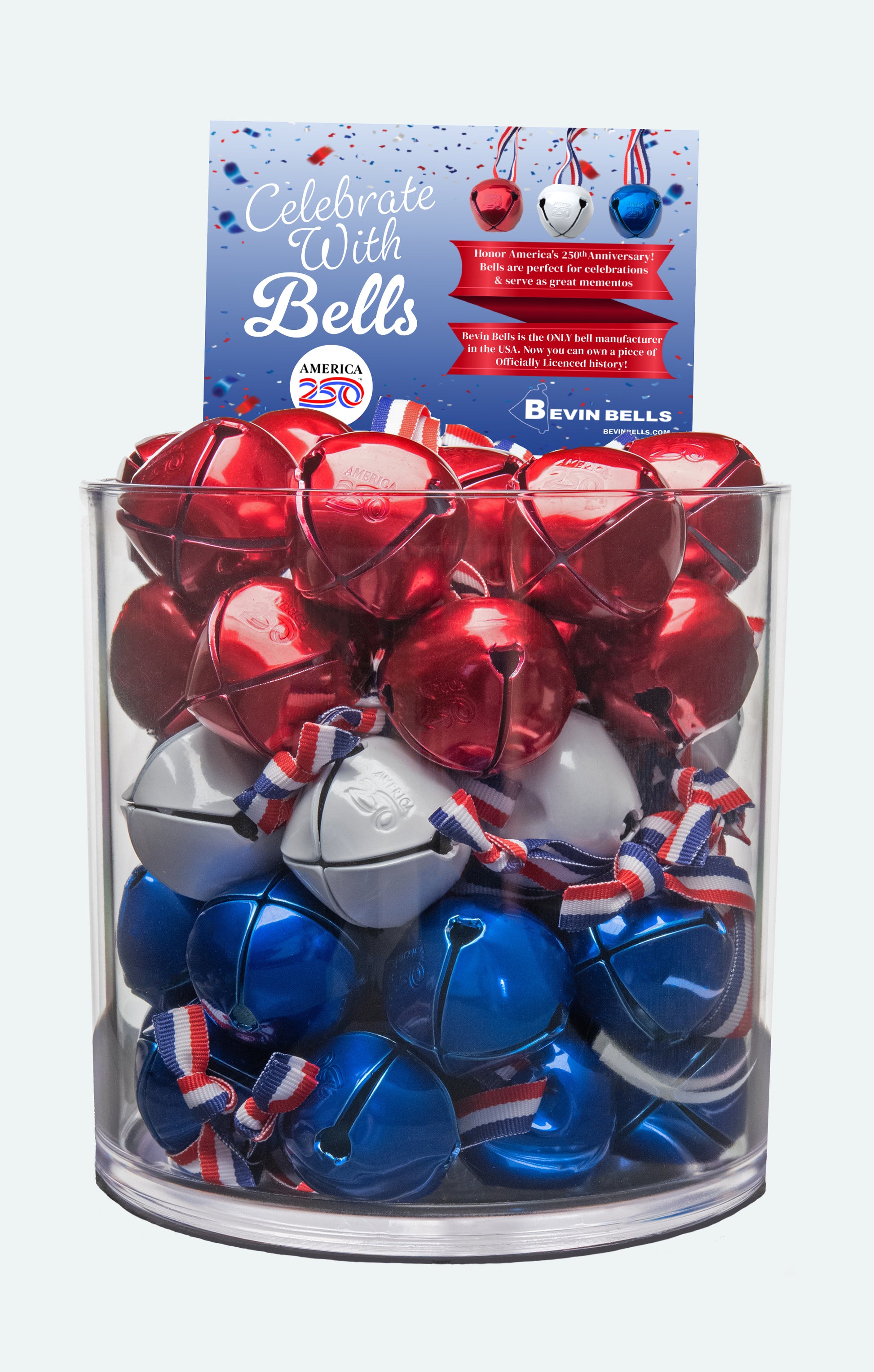 Made for retailers - this display includes 48 sleigh bells, a clear acrylic cylinder, and a POS sign. 1.5" nickel sleigh bell, assorted colors (Red, White, & Blue) with officially licensed AMERICA 250 logo stamped into the bell & they are strung with Red, White, & Blue striped ribbon.