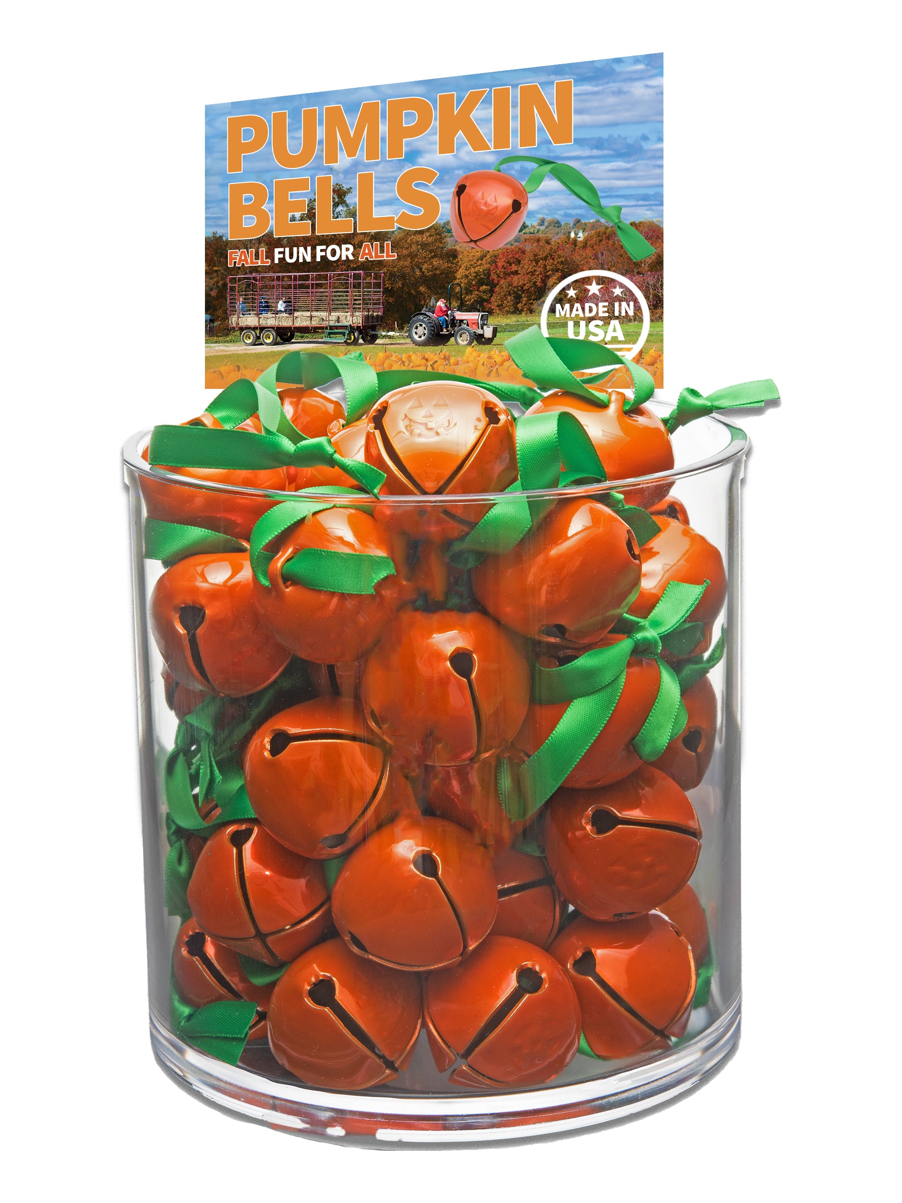 1.5" Orange powder-coated sleigh bell, strung with Green ribbon, pressed with a Jack-o-lantern face. Perfect fall season impulse buy & a great margin item. This includes 48 bells, a clear acrylic cylinder, and a POS sign.