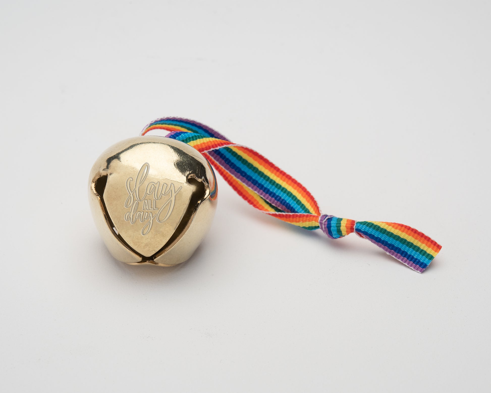 1.5" Brass sleigh bell, with "Slay All Day" stamped into the bell, strung with Rainbow ribbon.